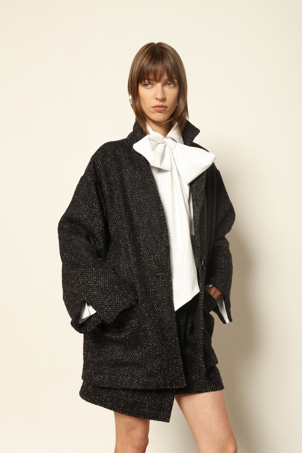 The Milano Mini Skirt by House of Woven Stories combines bold craftsmanship with timeless design. Crafted in Piemonte, Italy, it features a striking macro chevron pattern in shades of black, grey, and white woven from fine wool. The result is a refined balance of structure, texture, and modern elegance.
